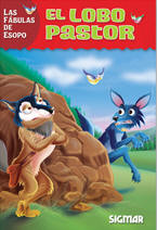 2011 El Lobo Pastor. Paperbound. Buenos Aires, Argentina: Colección Las Fábulas de Esopo: Sigmar. $5.40 from Christian Tottino, Argentina, through Bidstart, Oct., '14. This is a 16-page pamphlet 4½" x 6½". There is one sentence of the story and one image per page. This version of the story is curious. I had trouble at first telling in the pictures which animal was guard-dog and which was wolf, especially because the wolf wears a spikey collar. Does the guard-dog wear a gun? The wolf dresses up in the shepherd's clothes but still howls -- and attracts the attention of both shepherd and guard-dog. The shepherd hits the fleeing wolf on the head with a rock and the dog bites him all over before he escapes, finding himself "un completo tonto." The moral: "La desgracia llega a quienes tratan de lastimar a otros." I wish that were true! | ||||