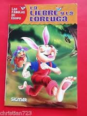2011 La Liebre y la Tortuga. Paperbound. Buenos Aires, Argentina: Colección Las Fábulas de Esopo: Sigmar. $5.40 from Christian Tottino, Argentina, through Bidstart, Oct., '14. This is a 16-page pamphlet 4½" x 6½". There is one sentence of the story and one image per page. In this version, the tortoise enjoys walks in order to admire the flowers and birds. Both characters have human clothes. The rabbit falls over with laughter at the tortoise's outrageous suggestion of a race. The rabbit's rest turns into profound sleep. The moral: "Con constancia, aunque lentamente, se alcanza la meta." | ||||