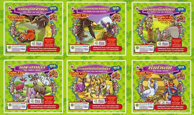 Here is a story not known to me. Three brother goats want to cross a bridge to better pasture, but there is a crocodile beneath the bridge. The youngest brother gets across by urging the crocodile to wait for his meatier brothers. Perhaps the second brother is distracting the crocodile, and the strongest brother butts him into the river. The stated moral is "He who thinks carefully will not be cheated by others." The moral page adds to a standard picture of a child reflecting four images from this particular story. The editors struggle so much with English in this story that it may be hard to follow. A key sentence comes from the second brother: "Please don't eat we up and you released us to go." The front-cover on both sides has symbols for Green Life publishing, Green Ocean paper, and yessoy ink. The publisher's symbol seems to be two purple heads reading an open red book; it is repeated three times. There is a page of vocabulary on the inside back cover, with a picture of all six books in the series on the back cover. The pamphlet is twelve pages long, about 7½" x 6¾".