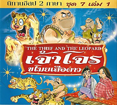 I have a series, apparently "Series 7," with six pamphlets, each offering a bilingual presentation of a fable. Here the first is a fable I have only otherwise encountered, to my knowledge, in another bilingual set from Thailand! As I wrote there, a leopard hears a couple during a storm speak of "leaking rain" that has killed many people. Hearing a noise, the leopard fears that it is "leaking rain" and hides in the barn. The noise is actually from a thief trying to steal the ox. He mistakes the leopard for the ox. He rides off on the leopard's back and they soon part, each shouting "Help!" The ugly bearded cheek of the thief stands out even on the cover, which offers various images from this fable. The art is dramatic comic-book art, one panel to a page. The back cover shows the six items in this collection. There seem to be two different speech "bubbles" of Thai on each page but only one of English. What is that second non-English bubble about?