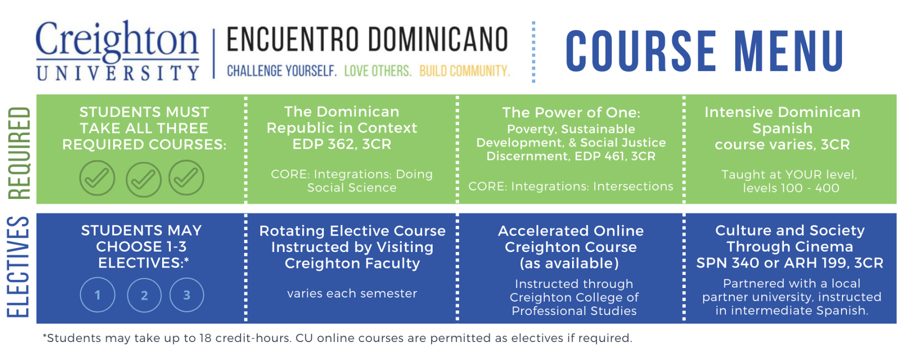Encuentro Dominicano students are required to take the three courses listed below in green, and may choose from the electives available each semester for a total of up to 18 credit-hours. Course details are available here.