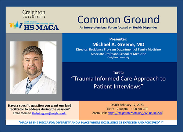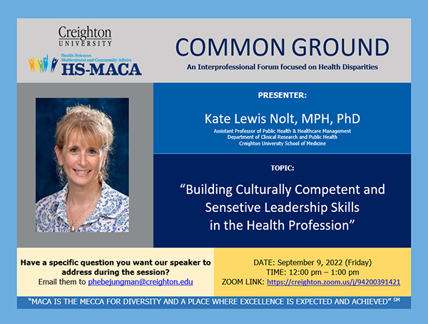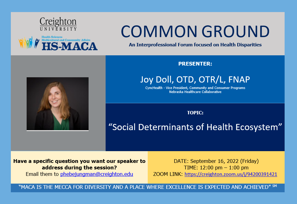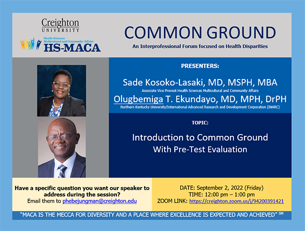 Common Ground is a weekly interprofessional forum sponsored by Health Sciences - Multicultural and Community Affairs through its Community Oriented Primary Care (COPC) Program. In Common Ground, all health sciences students can learn the principles of health disparities and health equity from health professionals, researchers and community partners.