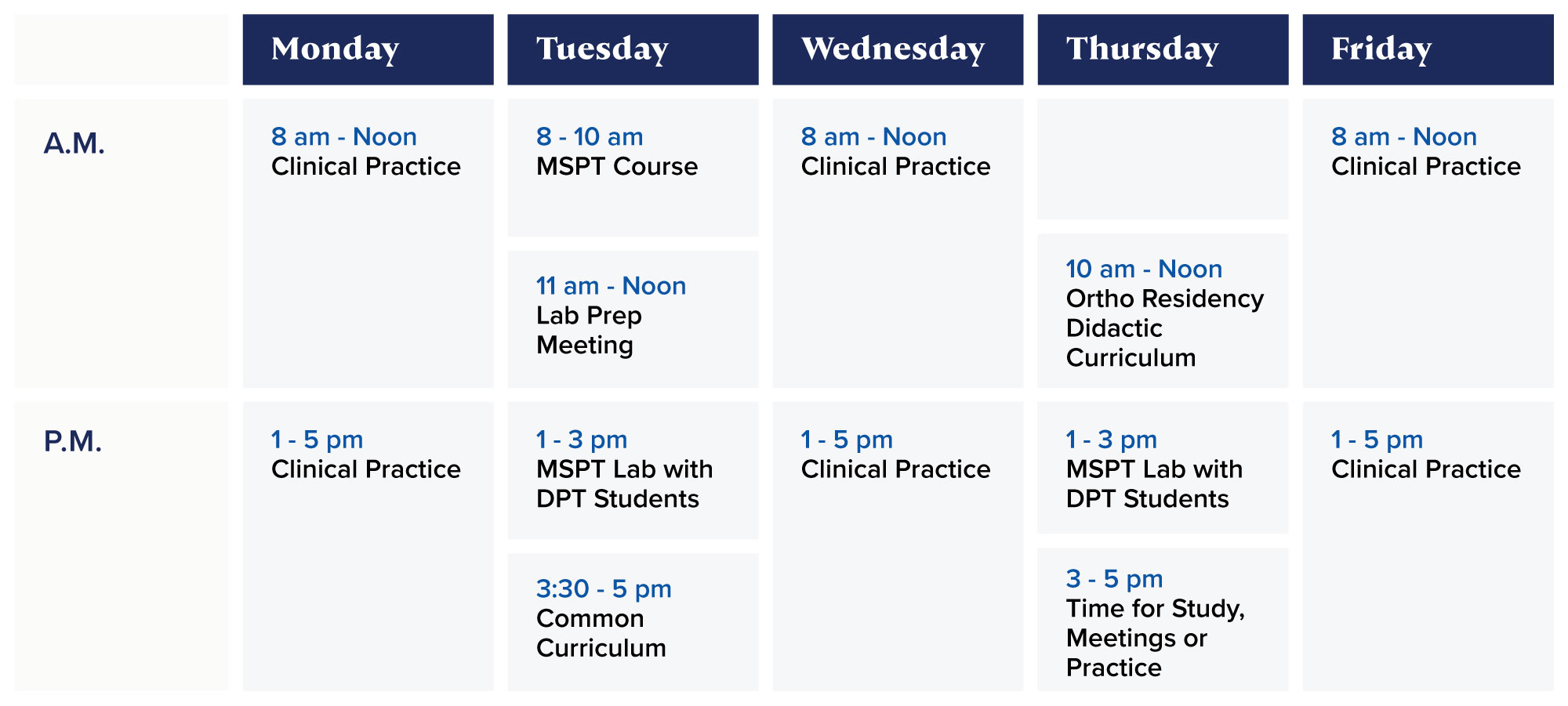 The program is committed to developing specialization in advanced orthopaedic clinical practice, teaching and advocacy by providing focused, ongoing mentorship in preparation of residents who will become leaders in orthopaedic physical therapy practice.