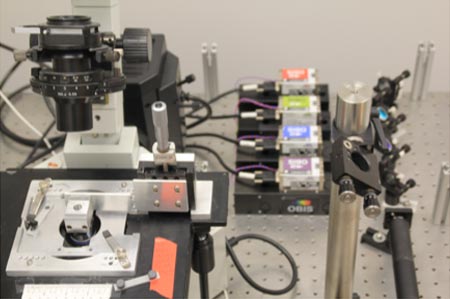 This through-the-prism TIRF system was built in-house on an Olympus’ inverted microscope body.